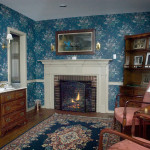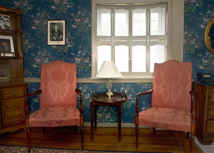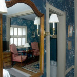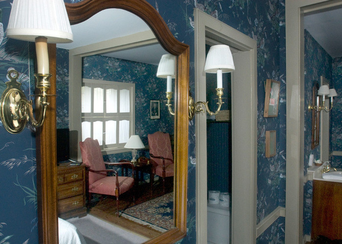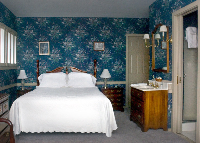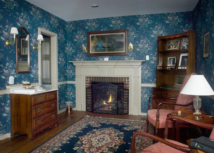 This luxurious suite has a wonderful sitting area accentuated by a fireplace with soft blue tones. The oriental rug and period furniture bring a sense of warmth and comfort from long ago. The queen size bed faces the fireplace for romance. This suite contains his and her bathrooms for added convenience.