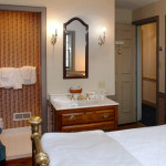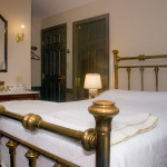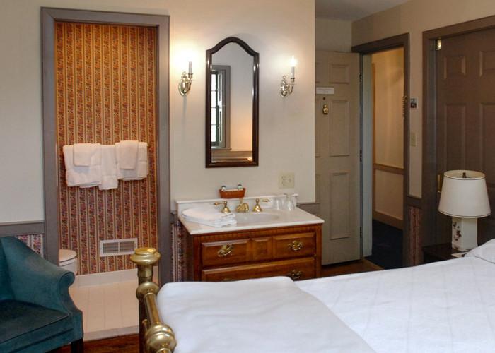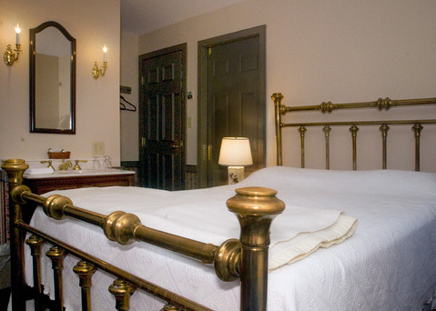 Classic room with full size brass bed. Features hardwood floor, oriental rug, box window, two comfortable upholstered chairs. Vanity located in bedroom.